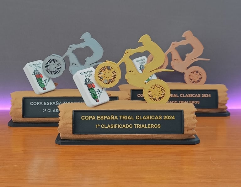 Los trofeos fueron personalizados con elementos clave del evento, incluyendo la moto de trial, el logo del Motoclub Aiala y el tronco de la peana.